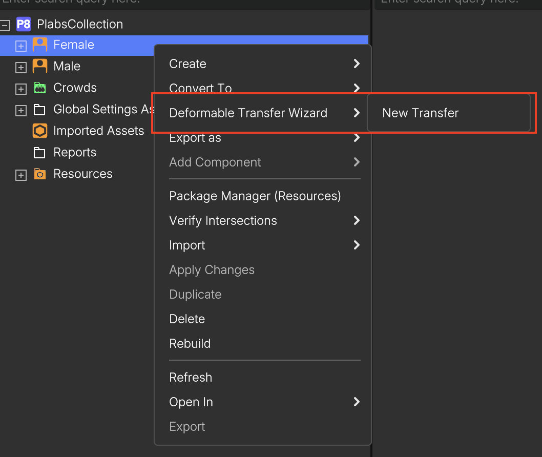 - Select the Template, right-click and select Deformable Transfer Wizard.