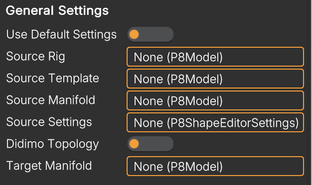 - Didimo Topology - Activate if source and target Templates have the same topology on all affected meshes (Source and Target Manifold fields get disabled).Deactivate if source and target Templates have different topologies.