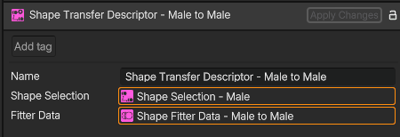 The Transfer Descriptor object is the responsible for managing the transfer of assets between 2 templates. When this object is added to the Transfer Descriptors of a given template and is correctly set up, it will essentially hold a description of which shapes are we transferring to this template (Shape Selection) and how are we transferring these shapes to this template (Fitter Data).