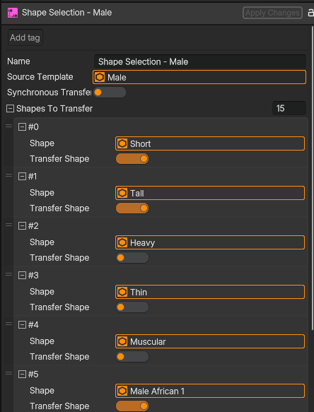 The Shape Selection object essentially manages the selection of shapes of a given source template. You can either choose a Synchronous Transfer, which will transfer all the shapes a template currently has and all the shapes that will be added in the future, or turn it off and choose only the ones you want to transfer.